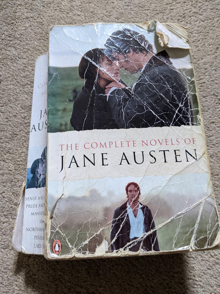 I have a Jane Austen Collection book that has ALL her novels in one, that I have had for a long time. It also already looks like it was washed up on an island and eaten by the local wildlife so no need to worry about damaging it either!