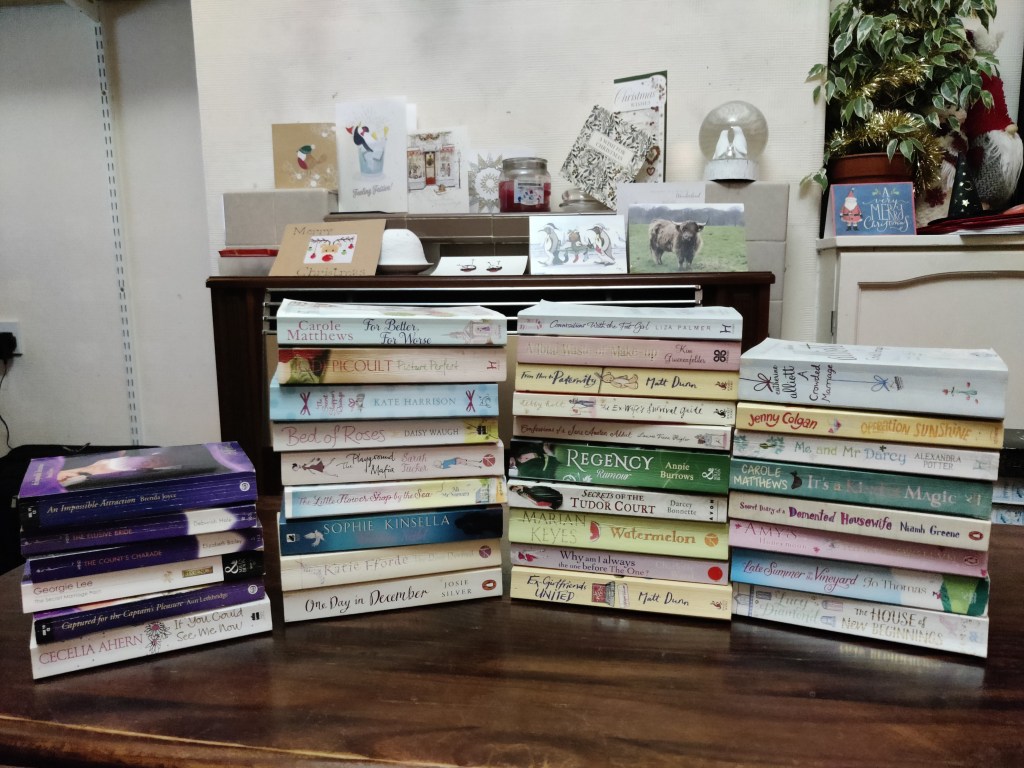 This is my pile of Bath Books. They look to be frivolous feel-good books that I will be able to wind down with and enjoy when I feel like I need a break, which is exactly the sort of mood with which one normally heads to the bath tub. My Other Half came up with the rather genius idea to put these books on the bookshelf outside the bathroom, which I’m sure would have occurred to me eventually… They now live on their very own shelf outside the bathroom. Most of these books can be blamed on Grandma.