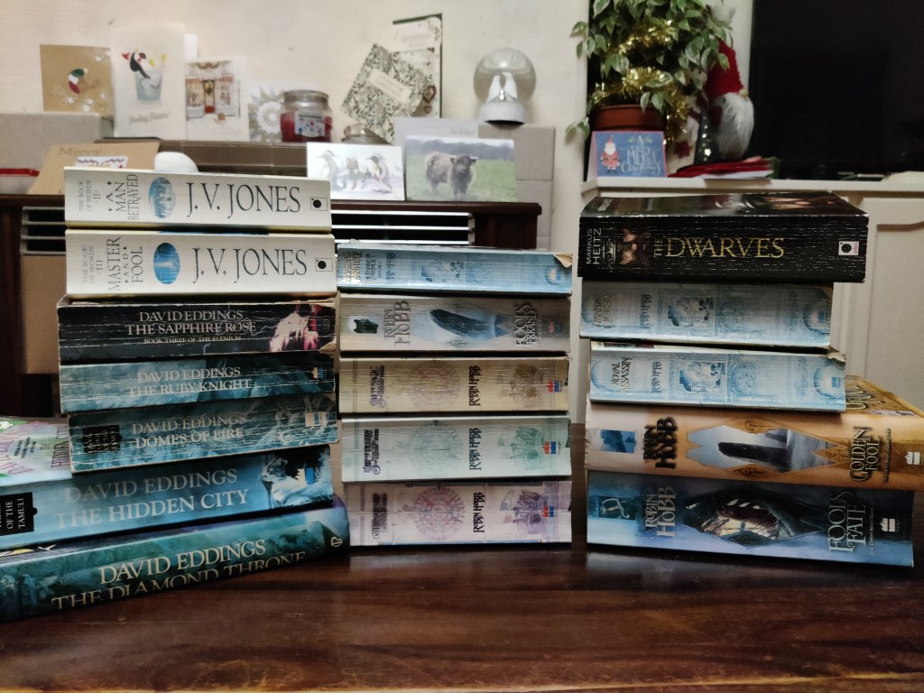 These fantasy books were all (but one) given to me by my Dad’s girlfriend at the time who saw that I was starting to buy David Eddings books. She promptly gifted me her entire David Eddings series, along with all of her Robin Hobb and J V Jones books, most of which I have already enjoyed – Thanks Sam! These are still waiting for the right moment to be devoured.